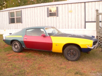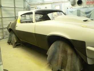In 2007 I found a bodyman in NC that was a huge Mad Max fan and he agreed to do the latest car for me. It started with a rusted out 73 camaro (see the Before Photo). The car got new inner and outer quarters, pans, and sail panel. We added a custom 3 scoop hood, custom roof spoiler,movie correct working lights and matching siren, badges and lettering. The front frame was removed, blasted, and painted with all new parts. Also added were new interior,chrome wagon wheels, and a pypes polished stainless exhaust that eerily sounds exactly like max's car. As for the powertrain, it has a 454 w/Barry Grant Tri-Power (est 550 hp), a manual reverse turbo 400 and a 3:42 10 bolt posi. This is the car I wished I could build in 1986.